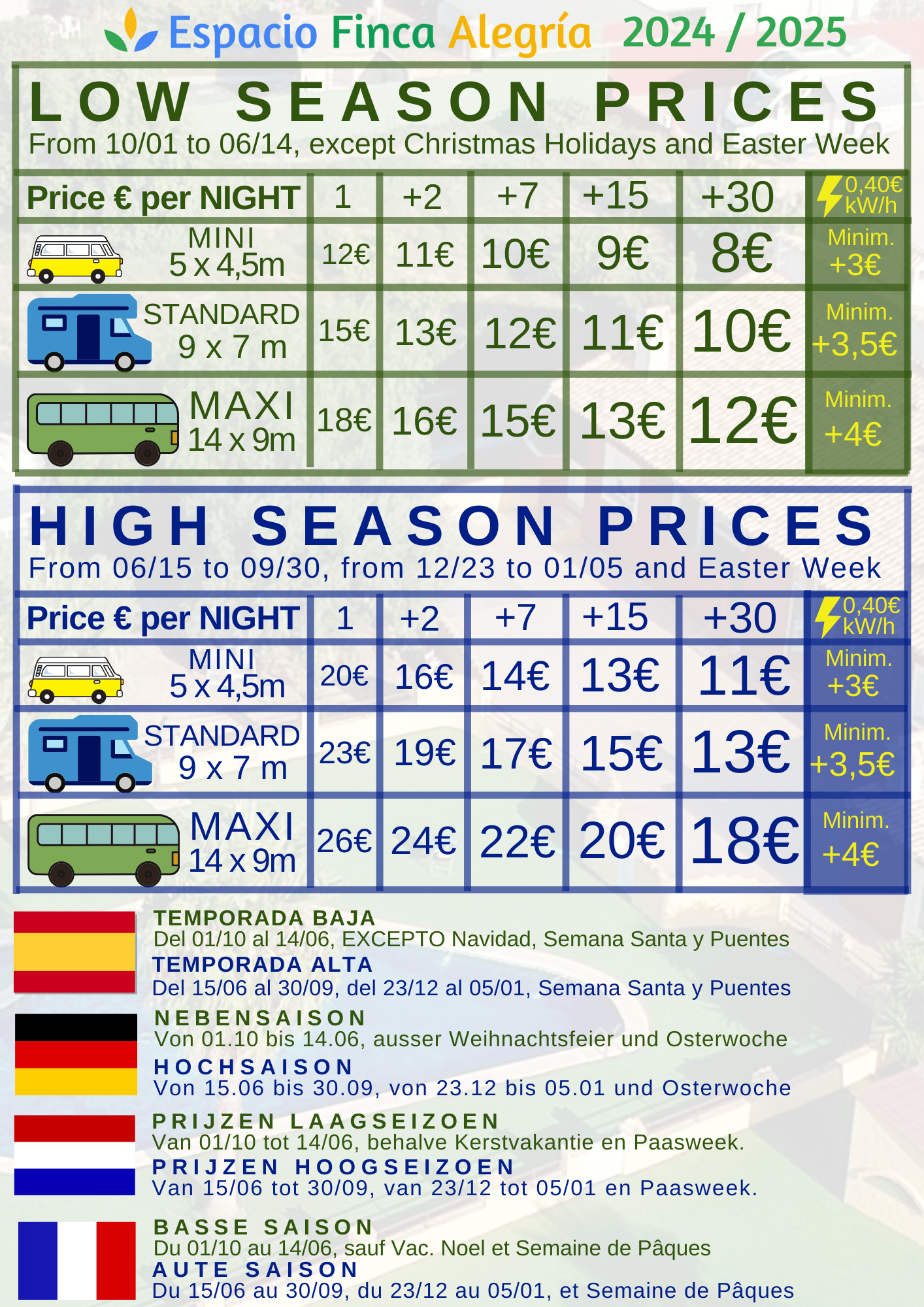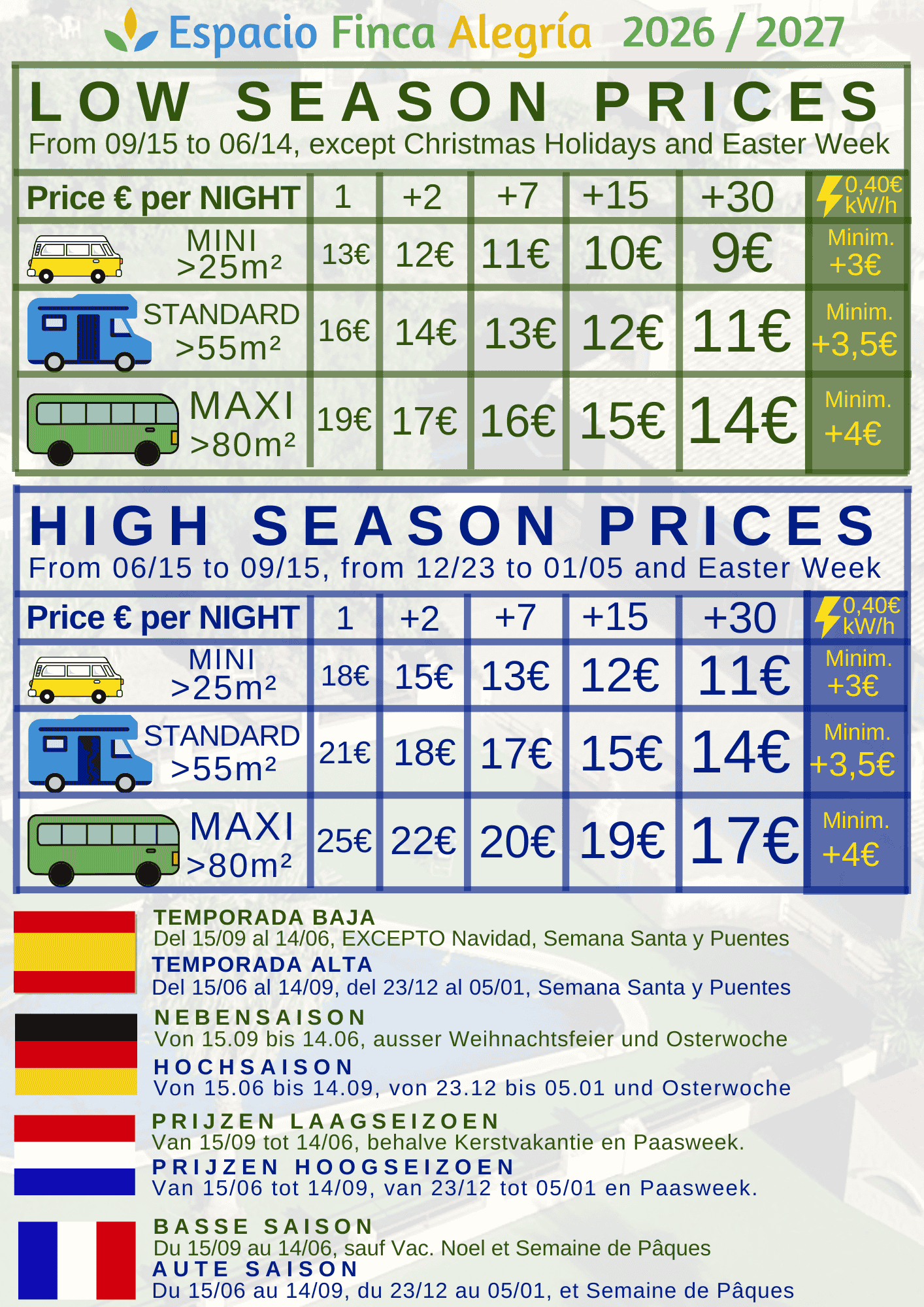 Más de 12 años: 3€/noche en temporada baja. 5€/noche en temporada alta.
